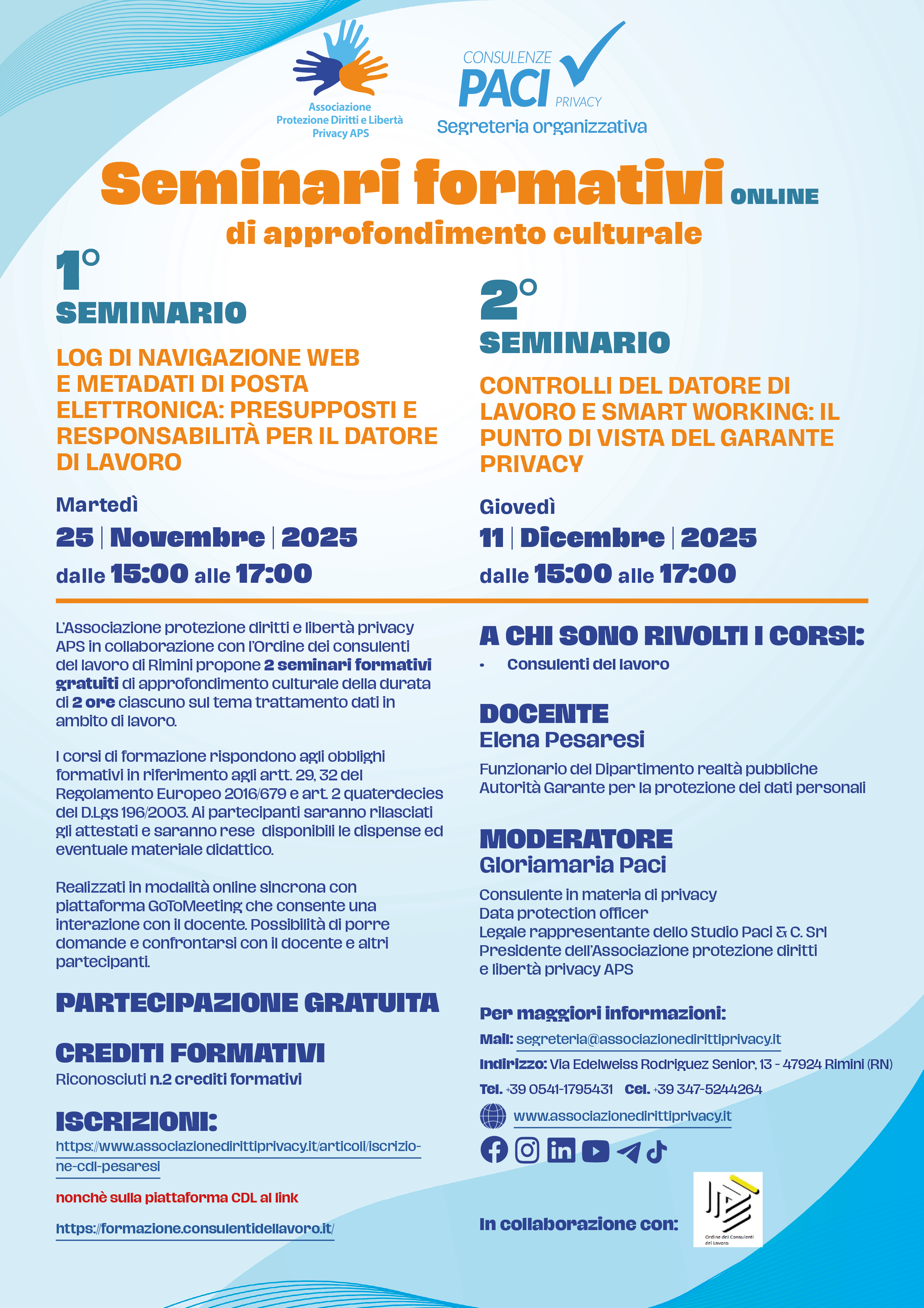 L’Associazione protezione diritti e libertà privacy APS in collaborazione con l’Ordine dei consulenti del lavoro di Rimini propone 2 seminari formativi gratuiti unicamente per i consulenti del lavoro.
