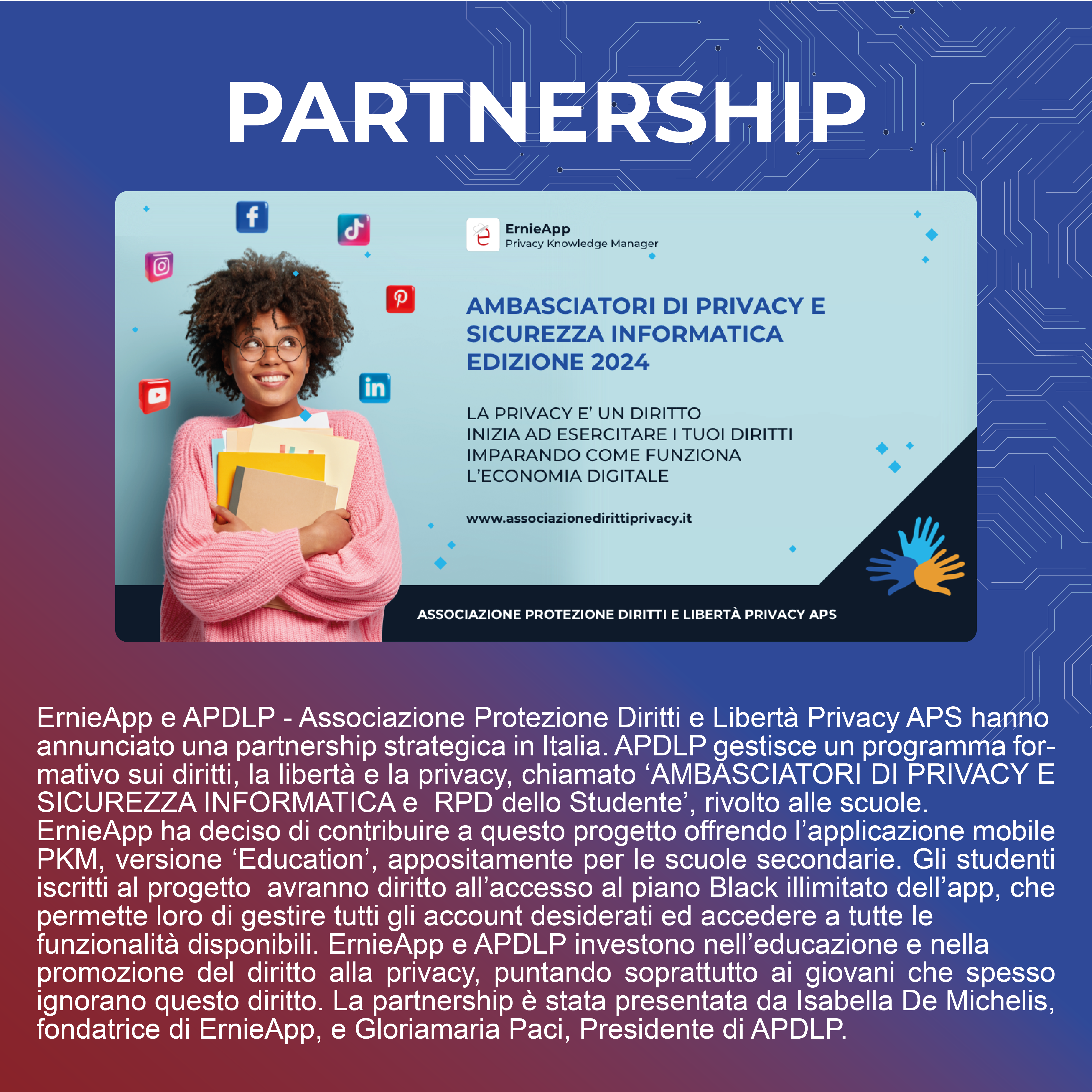 ErnieApp e APDLP - Associazione Protezione Diritti e Libertà Privacy APS hanno annunciato una partnership strategica in Italia. APDLP gestisce un programma formativo sui diritti, la libertà e la privacy, chiamato ‘Ambasciatori di Privacy e sicurezza informatica e RPD dello Studente’, rivolto alle scuole.